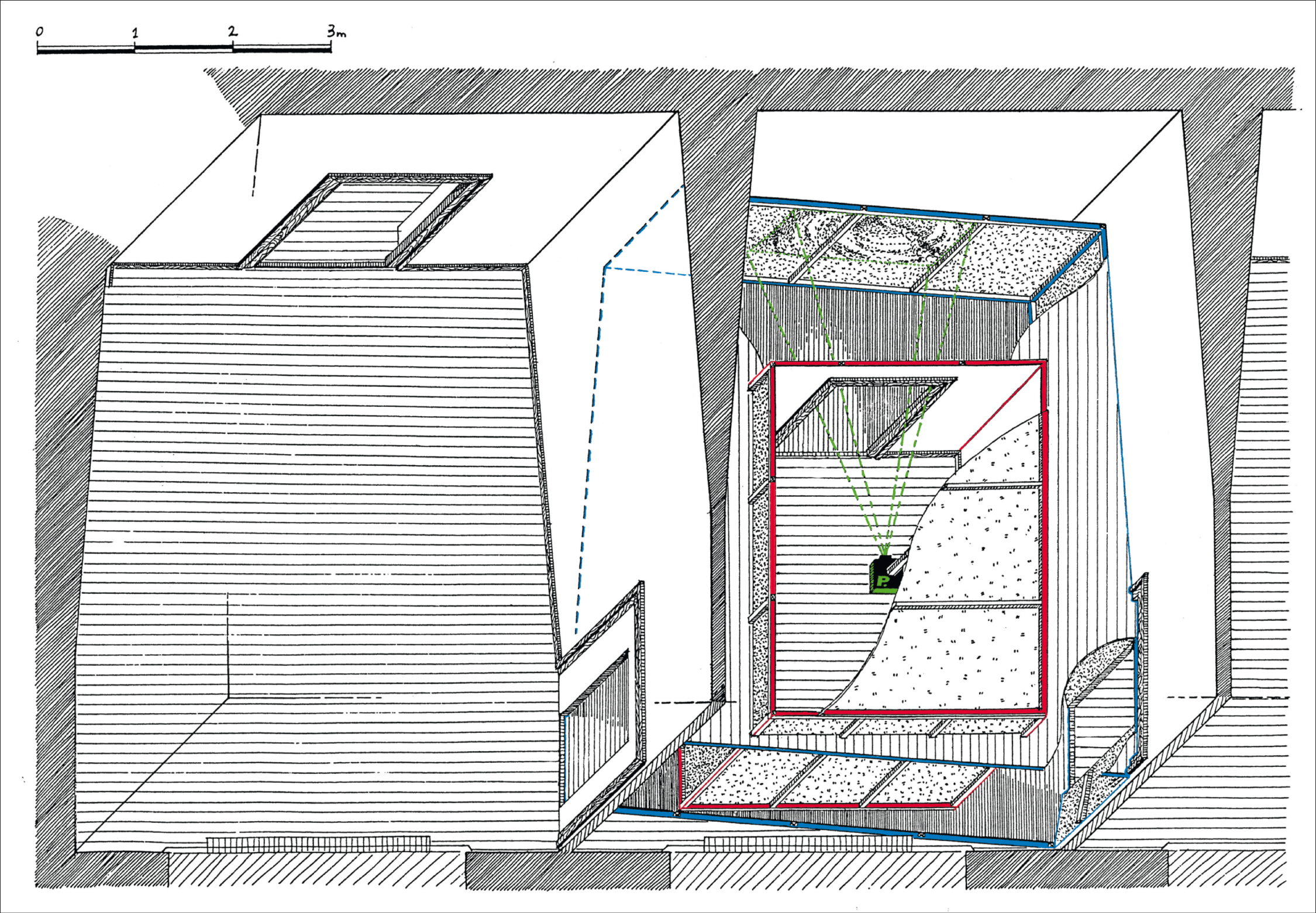 a jeho dvoutřetinovou kopií do něj vloženou materiály: dřevo, dřevotříska, barva, videoprojekce