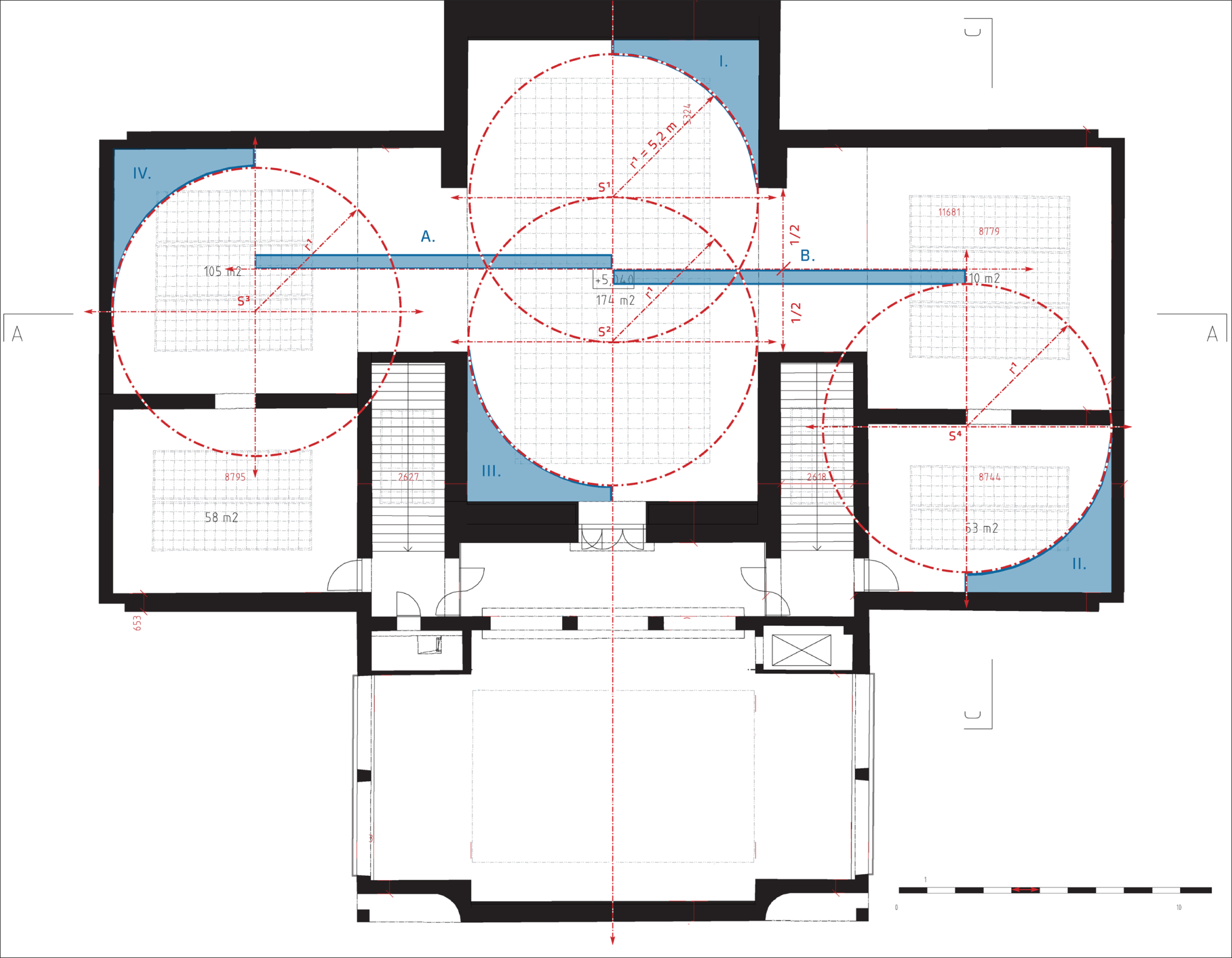 Čtvrtkruhy, 2015 | dispozice čtyř čtvrtkruhových výstavních panelů vložená do půdorysu