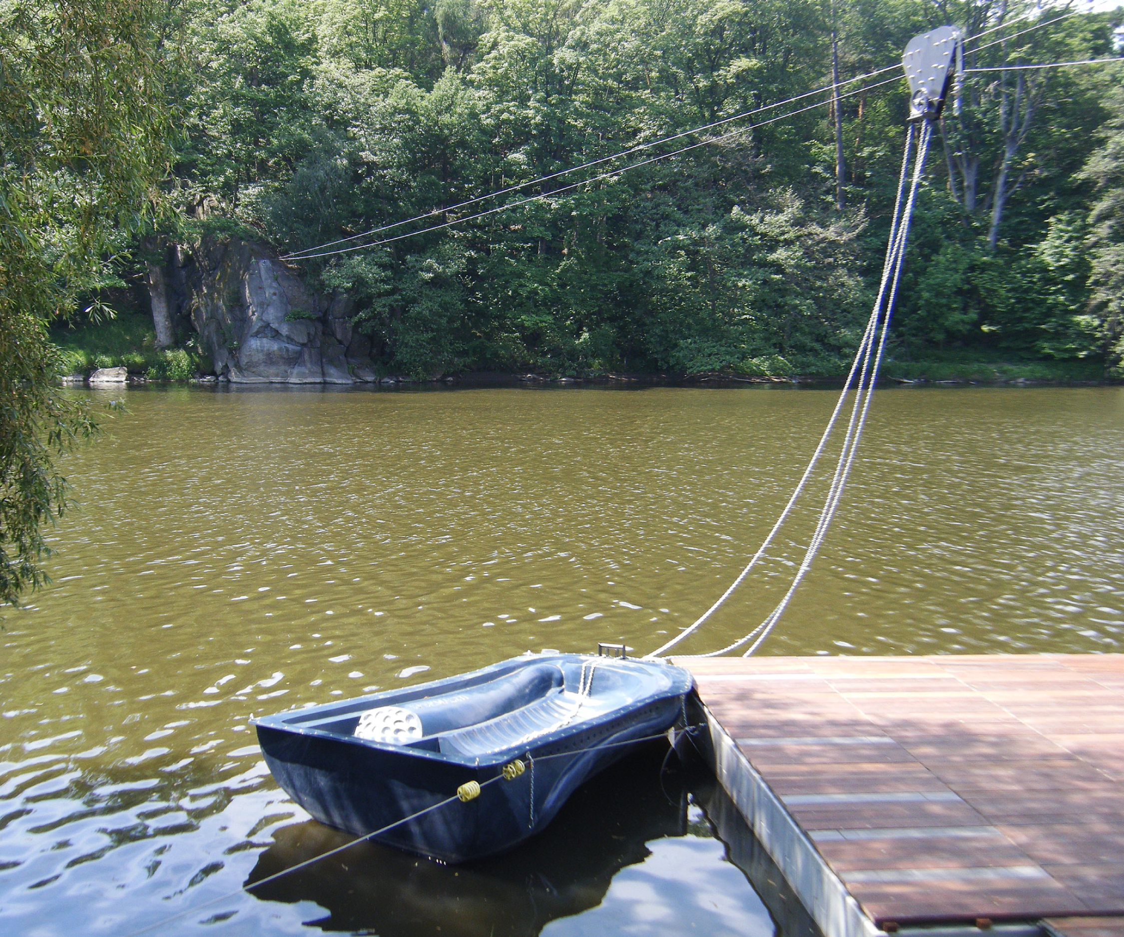 s ukotvením lana na protějším břehu – skále ve výšce 5m.