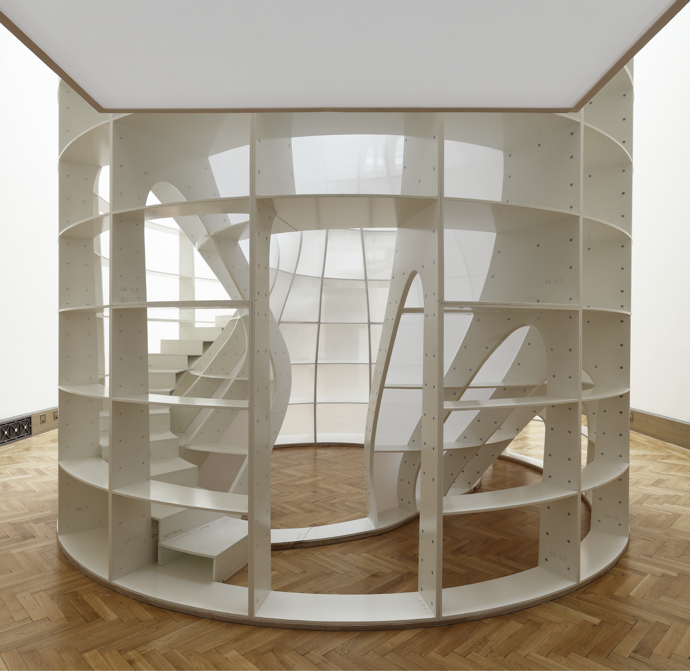 Rig (těžební věž) 2016–2022 | prázdný/negativní prostor tordovaného sloupu definován svislými a horizontálními rovinami vnějšího válcovitého útvaru, který je obkroužen spirálovitým schodištěm končícím ve stropu sálu